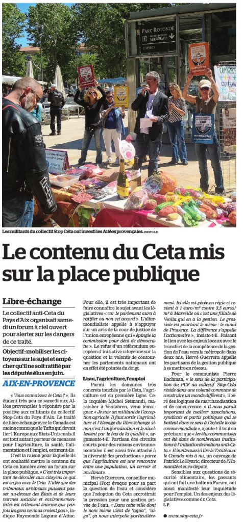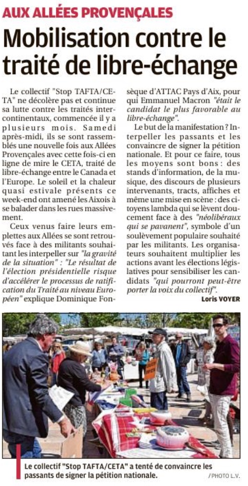 lire cet article ici Le collectif Stop Tafta-Ceta Aix-Gardanne-Salon organisait samedi 20 mai une mobilisation à ciel ouvert contre le traité de libre-échange entre l’Union Européenne et le Canada.