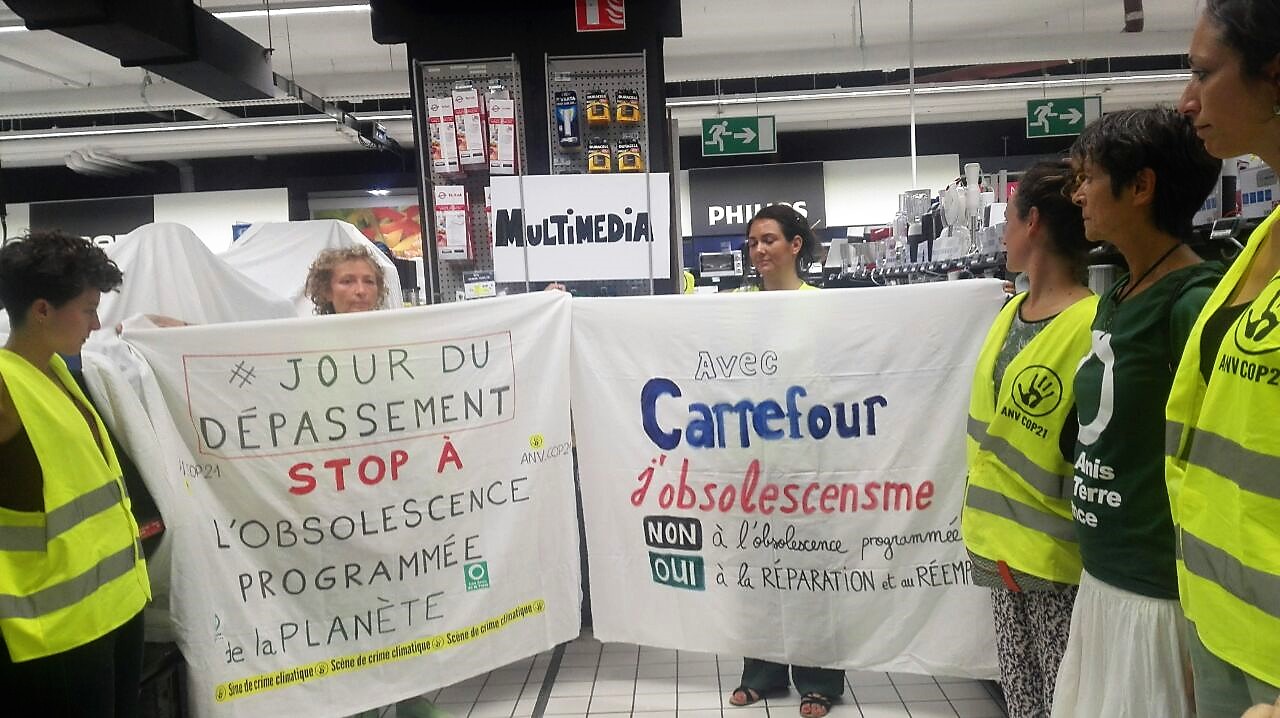 Jour du dépassement : action à Carrefour Marseille pour dénoncer la surconsommation des ressources naturelles.
